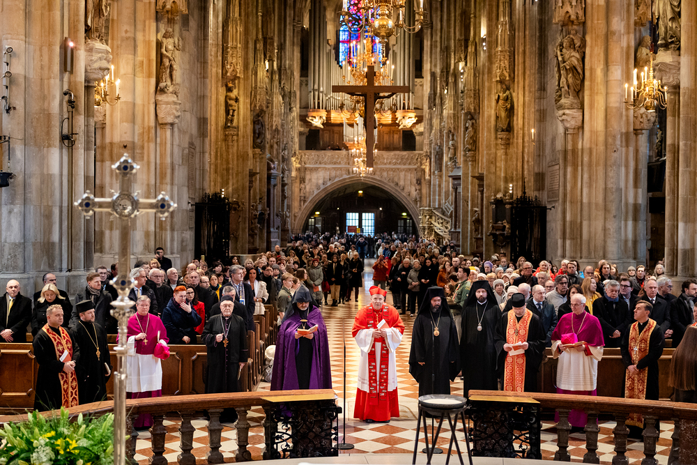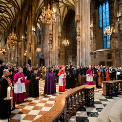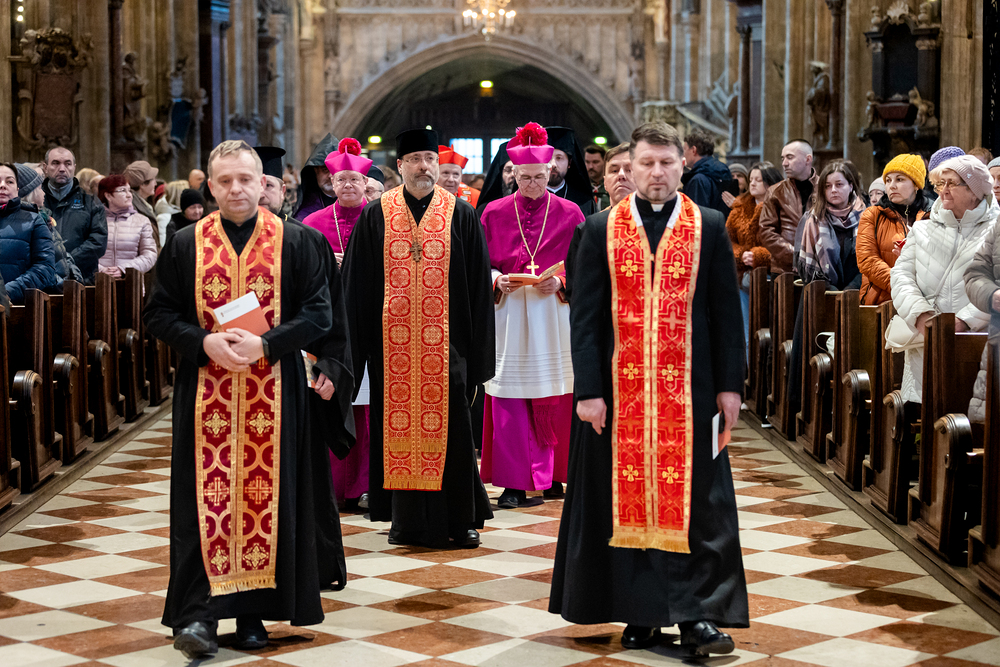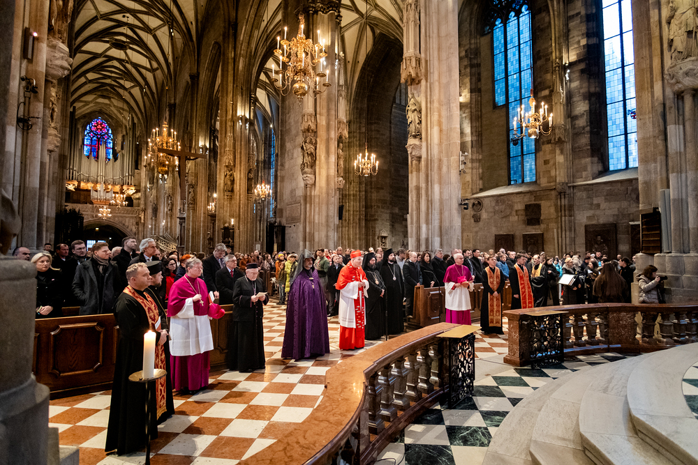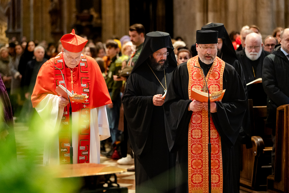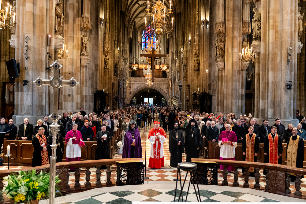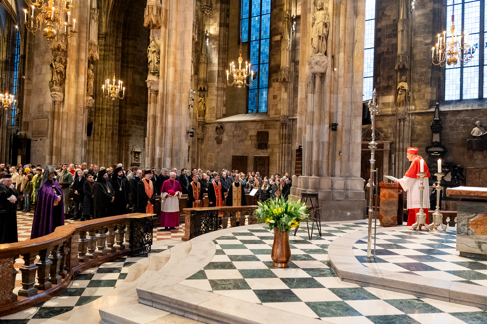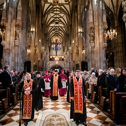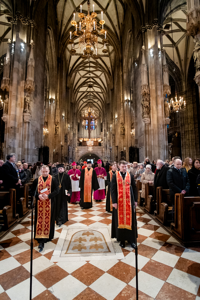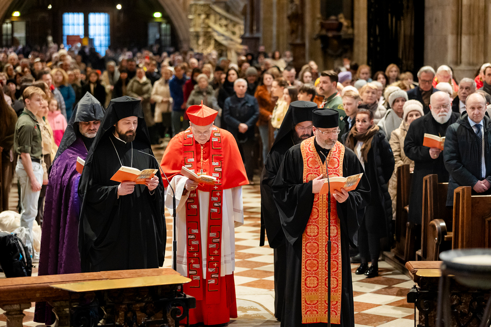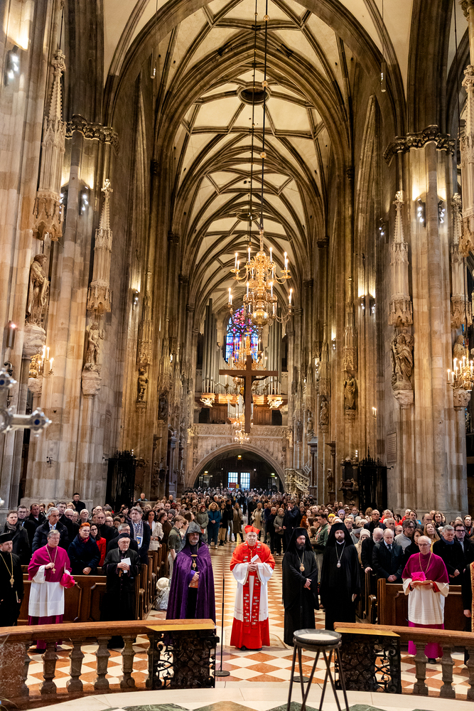 Zum dritten Jahrestag des russischen Angriffs auf die Ukraine fand im Wiener Stephansdom ein ökumenisches Friedensgebet statt, an dem Kardinal Christoph Schönborn teilnahm. Das Gebet wolle "die Stimmen der vielen Leidenden aufgreifen und ein Licht der Hoffnung inmitten der Dunkelheit entzünden. An dem Gottesdienst nahmen neben Kardinal Schönborn auch der päpstliche Gesandte in Österreich, Nuntius Erzbischof Pedro Lopez, der armenisch-apostolische Bischof und Vorsitzende des Ökumenischen Rates der Kirchen in Österreich, Tiran Petrosyan, der griechisch-orthodoxe Metropolit und Vorsitzende der Orthodoxen Bischofskonferenz in Österreich, Arsenios (Kardamakis), der für die ukrainischen Gläubigen in Österreich zuständige orthodoxe Weihbischof Maximos Rudko sowie Chorepiskopus Emanuel Aydin von der Syrisch-Orthodoxen Kirche teil; weiters etwa auch Ostkirchen-Generalvikar Yurij Kolasa, der Wiener Weihbischof Franz Scharl und Domdekan Rudolf Prokschi. Desweiteren erinnerte die Caritas bei einem Lichtermeer aus Tausenden auf dem Wiener Stephansplatz entzündeten Kerzen an das Schicksal der Menschen im Ukrainekrieg.Wir waren mit der Kamera dabei.