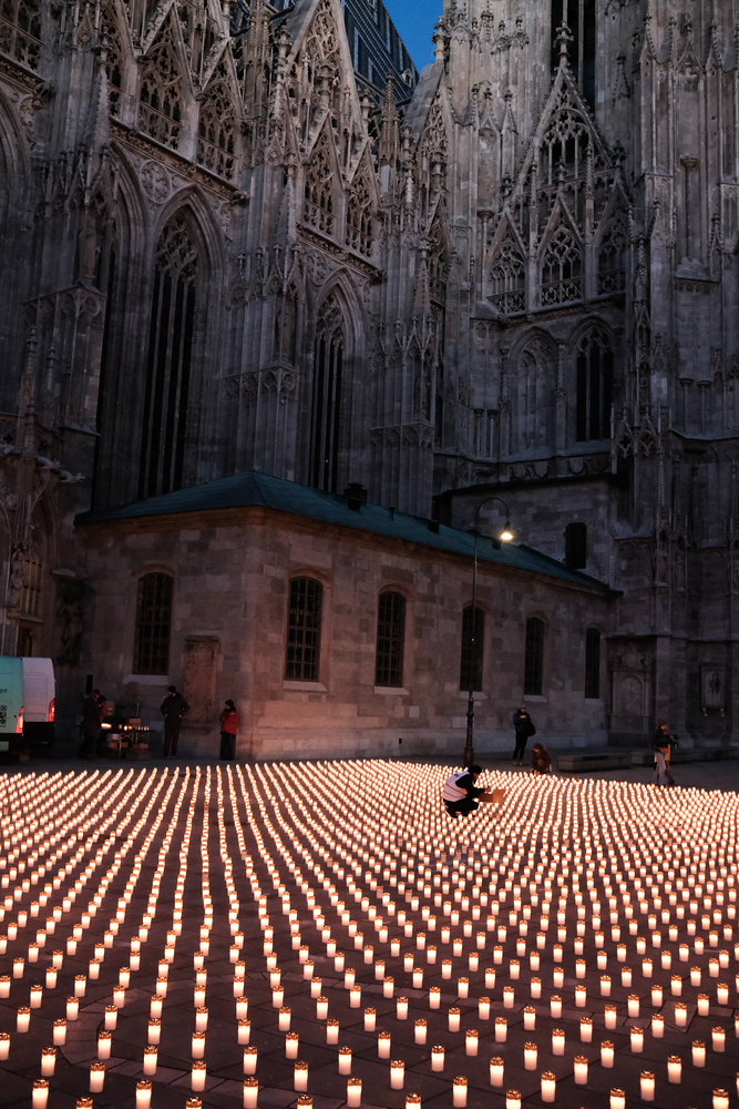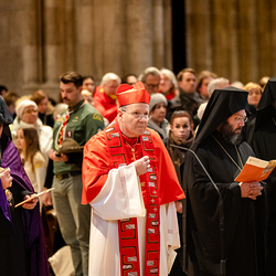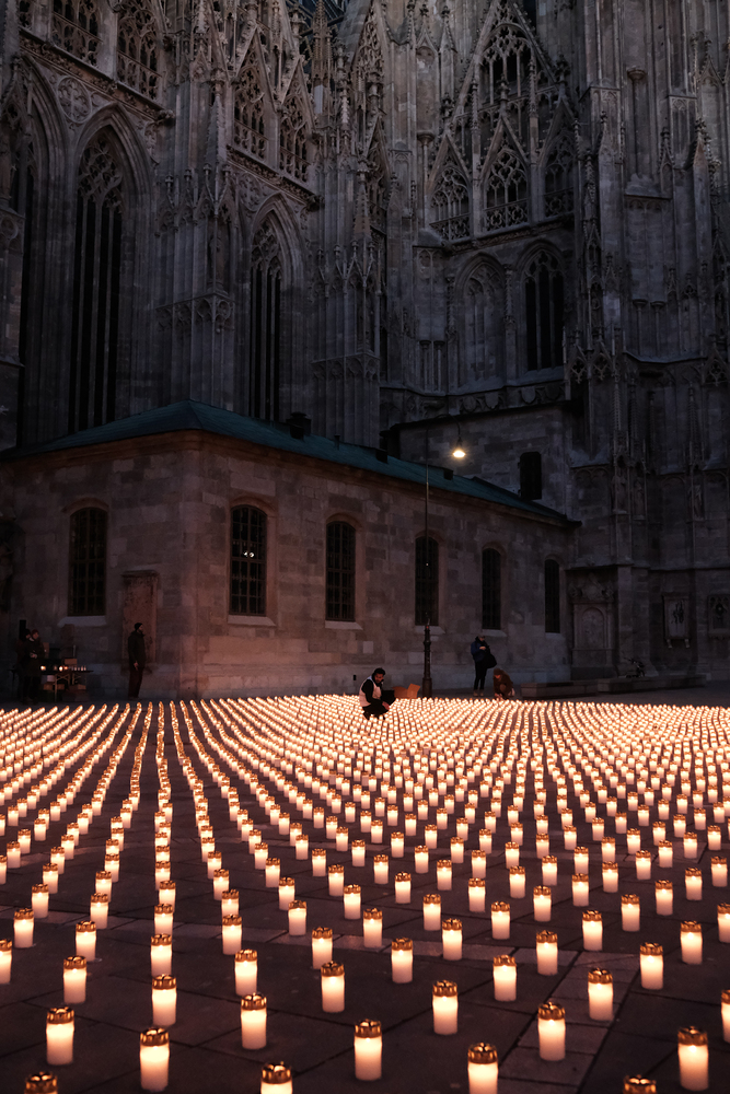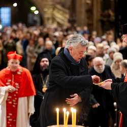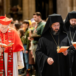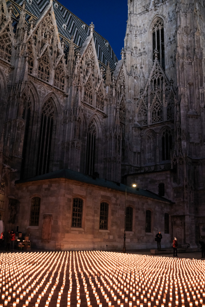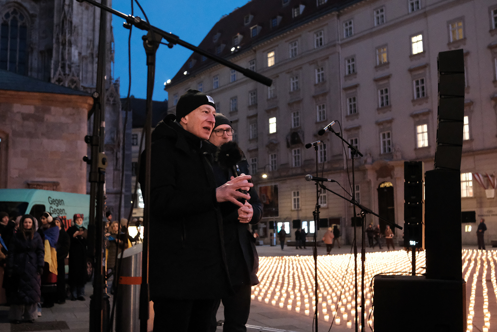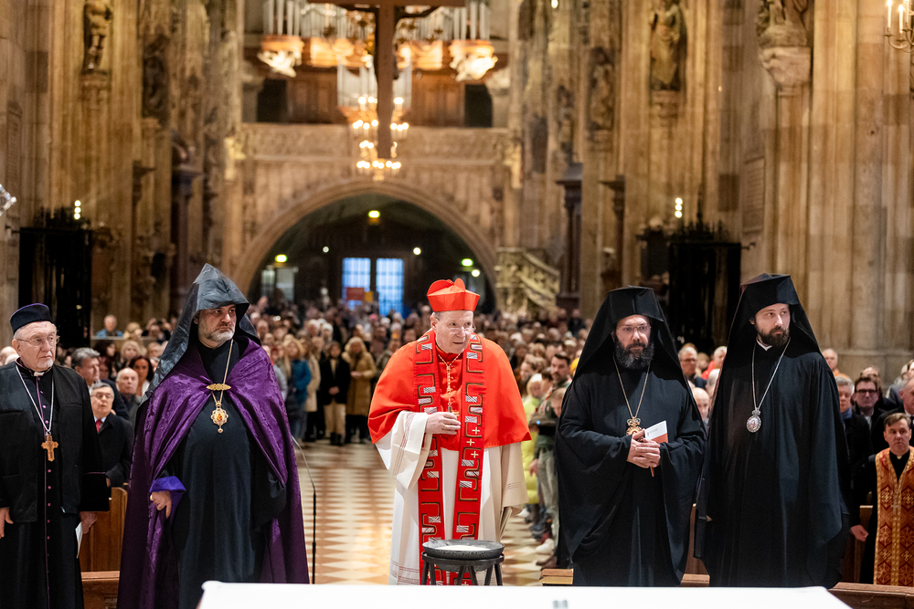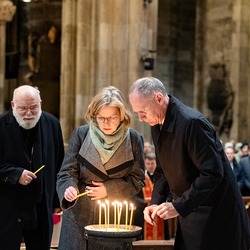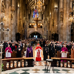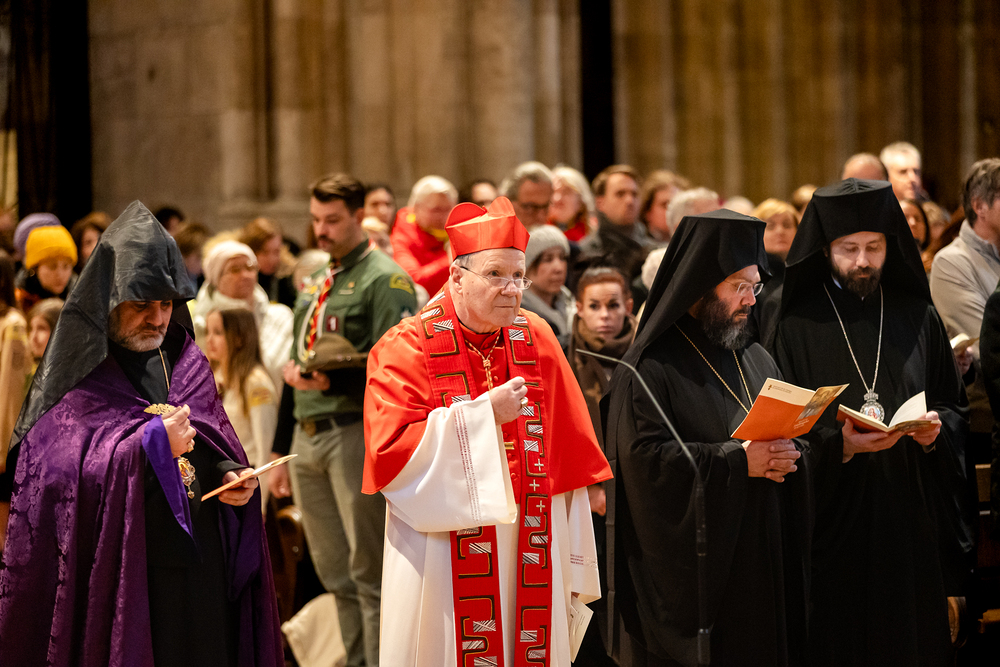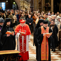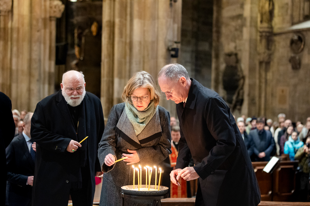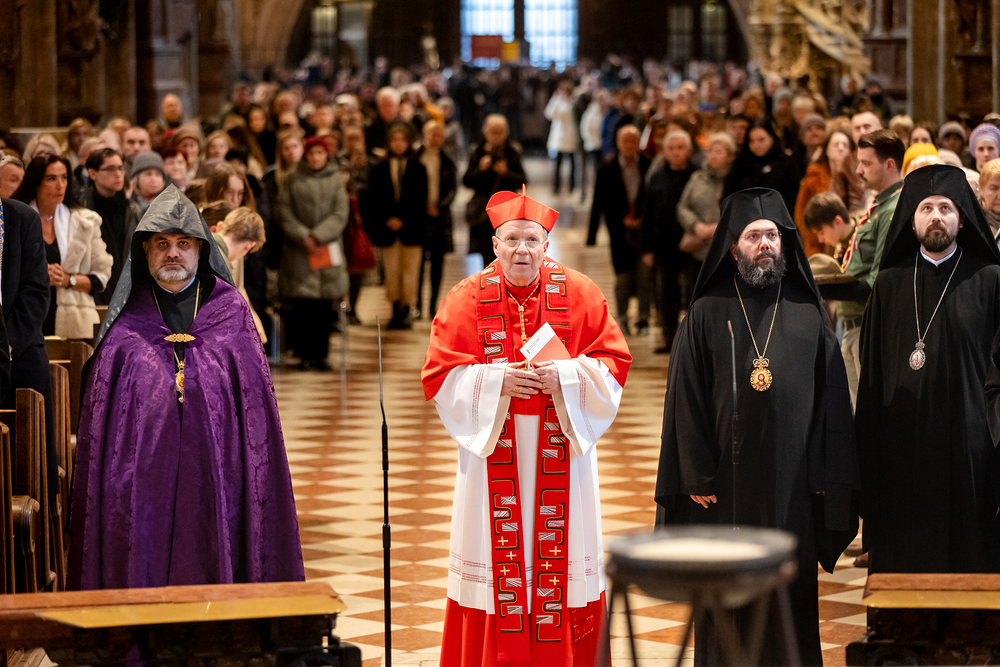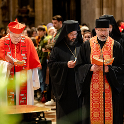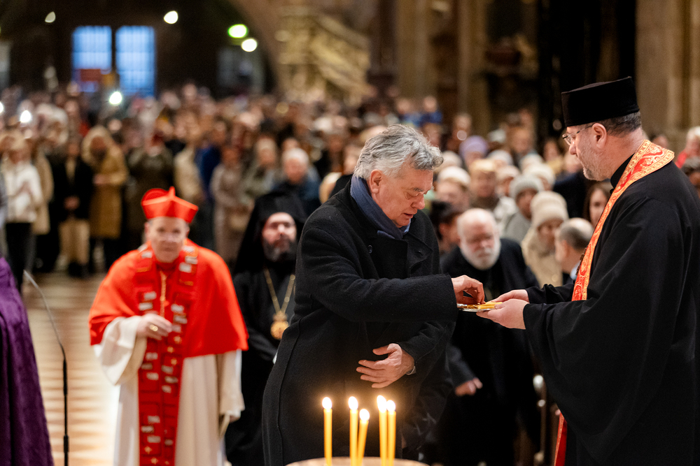 Zum dritten Jahrestag des russischen Angriffs auf die Ukraine fand im Wiener Stephansdom ein ökumenisches Friedensgebet statt, an dem Kardinal Christoph Schönborn teilnahm. Das Gebet wolle "die Stimmen der vielen Leidenden aufgreifen und ein Licht der Hoffnung inmitten der Dunkelheit entzünden. An dem Gottesdienst nahmen neben Kardinal Schönborn auch der päpstliche Gesandte in Österreich, Nuntius Erzbischof Pedro Lopez, der armenisch-apostolische Bischof und Vorsitzende des Ökumenischen Rates der Kirchen in Österreich, Tiran Petrosyan, der griechisch-orthodoxe Metropolit und Vorsitzende der Orthodoxen Bischofskonferenz in Österreich, Arsenios (Kardamakis), der für die ukrainischen Gläubigen in Österreich zuständige orthodoxe Weihbischof Maximos Rudko sowie Chorepiskopus Emanuel Aydin von der Syrisch-Orthodoxen Kirche teil; weiters etwa auch Ostkirchen-Generalvikar Yurij Kolasa, der Wiener Weihbischof Franz Scharl und Domdekan Rudolf Prokschi. Desweiteren erinnerte die Caritas bei einem Lichtermeer aus Tausenden auf dem Wiener Stephansplatz entzündeten Kerzen an das Schicksal der Menschen im Ukrainekrieg.Wir waren mit der Kamera dabei.